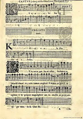 Victoria was born in Sanchidrián in the province of Ávila, Castile, around 1548 and died in 1611.[3] Victoria's family can be traced back for generations. Not only are the names of the members in his immediate family known, but even the occupation of his grandfather.[4] Victoria was the seventh of nine children born to Francisco Luis de Victoria and Francisca Suárez de la Concha. His mother was of converso descent.[5] After his father's death in 1557, his uncle, Juan Luis, became his guardian. He was a choirboy in Ávila Cathedral. Cathedral records state that his uncle, Juan Luis, presented Victoria's Liber Primus to the Church while reminding them that Victoria had been brought up in the Ávila Cathedral.[6] Because he was such an accomplished organist, many believe that he began studying the keyboard at an early age from a teacher in Ávila.[7] Victoria most likely began studying "the classics" at St. Giles's, a boys' school in Ávila. This school was praised by St.Teresa of Avila and other highly regarded people of music.[8]