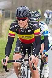 Tom Boonen (Dutch pronunciation: [ˈtɔm ˈboːnə(n)]; born 15 October 1980) is a Belgian former road bicycle racer,[1] who competed as a professional between 2002 and 2017 for the U.S. Postal Service and Quick-Step Floors teams and a professional racing driver who currently competes in Belcar, having previously competed in the NASCAR Whelen Euro Series. Boonen won the 2005 UCI World Road Race Championships, and was a single-day road specialist with a strong finishing sprint. He won the cycling monuments Paris–Roubaix 4 times and the Tour of Flanders 3 times, among many other prestigious victories, such as prevailing 5 times in the E3 Harelbeke, winning 6 stages of the Tour de France and winning the Overall title of the Tour of Qatar 4 times.[2]