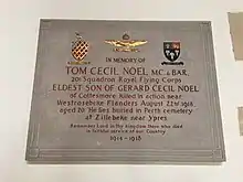 Noel was originally buried by the Germans at Westrozebeke, but was re-interred at the Perth (China Wall) Cemetery in Ypres, Belgium, in October 1924.[12] In Rutland he is commemorated in St Peter and St Paul's Church, Exton,[13] and on the war memorials at St Nicholas' Church, Cottesmore,[14] St Peter and St Paul's Church, Great Casterton,[15] and All Saints' Church, Little Casterton;[16] in the village of Exton he also appears on the base of the war memorial cross to the dead of Exton and Whitwell and to relatives of the Earl of Gainsborough, including Maurice Dease VC.[17][18] He has a memorial plaque in the grounds of Eton.[19]