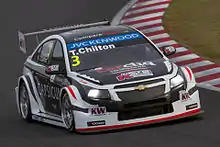 Chilton moved to RML for the 2013 season, driving a Chevrolet Cruze 1.6T alongside former world champion Yvan Muller.[17] He finished second behind Muller at the season opening Race of Italy[18] He took his first WTCC pole position at the Race of the United States, beating teammate Muller.[19] From pole he held off Tiago Monteiro to claim his first race win in the World Touring Car Championship. During the final race of the season, the 2013 Guia Race of Macau, Chilton dropped out with exhaust problems but not before being involved in the accident that caused the second red flag of race 2, as Eurico de Jesus hit him and under the subsequent safety car multiple drivers barreled into each other at the scene to cause the red flag.