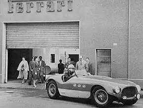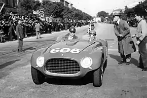 In March 1952, Cole took second place in the Vero Beach 12 Hour Endurance Road Race. He was surrounded by Ferrari drivers on the podium.[39] That summer he launched his European racing campaign at Le Mans, with a Ferrari 225 S, serial number 0152EL, belonging to his co-driver ”Pagnibon” but entered by Scuderia Ferrari. They ran as high as 15th before retiring with ignition issues. Shortly after, he purchased his own Vignale bodied 225 S, serial number 0194ET.[1][4] He drove it in two Italian road races: the Targa Florio (placing 11th overall)[4][40] and the Dolomites Gold Cup Race (15th overall).[41] August saw Cole return to Britain with his Ferrari. He took part in the Daily Mail International Festival at the Boreham Circuit, finishing fifth in the S+2.0 race despite fading brakes.[42][43] A fortnight later, he partnered Graham Whitehead in the inaugural Goodwood Nine Hours, finishing second in a race of high attrition despite again suffering fading brakes.[44][45][4][46] His Ferrari was photographed during this race and featured on the cover of Motor Sport in September 1952.[47] Cole followed this up with second place at the Bari Grand Prix.[48][1]