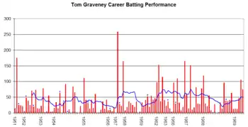 Hutton again curbed Graveney's attacking instincts during the 1953–54 tour of the West Indies after Graveney had started by hitting successive boundaries, telling him to "grind this one out".[4] Hutton later described Graveney as "not quite the chap for the big occasion" when Graveney's largest contribution to the 1954–55 tour of Australia was a century in the final Test match, by which point England had already won the series.[4] He had been dropped for two matches earlier in the series after being dismissed for 0 when playing an aggressive shot when the match situation called for caution.[2]