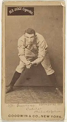 Overall, Gunning appeared in 146 major league games, compiling a career .205 batting average with 46 RBIs and two home runs.[2] All of his defensive appearances were at catcher, playing a maximum of 48 games in a season, which he recorded with the 1885 Boston Beaneaters.[2] He had a career .887 fielding average.[2] In his final two major league seasons, Gunning served as backup to Wilbert Robinson of the Athletics,[4] who later managed the Brooklyn Robins[lower-alpha 5] from 1914 through 1931 and was inducted to the Baseball Hall of Fame in 1945.