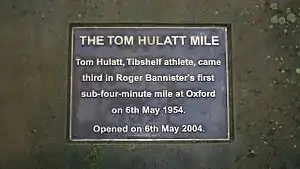 Hulatt suffered an Achilles tendon injury in 1960, and in his later years he did some coaching, but only ran at the annual Tibshelf Horticultural Show. He died aged 59 and was buried in the grounds of St. John the Baptist Church, Tibshelf. On the fiftieth anniversary of his run, a one mile stretch of the Five Pits Trail was designed as the 'Tom Hulatt Mile'[1] identified by two marker stones, with inscribed plaques, in coal measures sandstone donated by the National Trust.[3][4][5]
