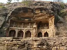 There are over 1500 Jain rock carvings inside the Gwalior fort, most of which were carved between 1440 and 1473, during the reigns of Dungarasimha (c. 1425-59) and Kirtisimha (c. 1459-80).[25] According to the Jain poet Raidhu, the development of Gopalagiri (Gwalior fort hill) as a Jain holy place (tirtha) was started by a Jain layman (sanghavi) named Kamalasimha. While this initiative was not a royal project, Raidhu states that Dungarasimha and Kirtisimha offered their full support to Kamalasimha.[26] Raidhu stayed at the Gwalior court at Dungarasimha's invitation.[27] Dungarasimha's minister Asapati was a patron of Raidhu.[26]