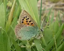 T. ballus F. (75 d, e). male above dark brown, with traces of small red spots in the anal area of the hindwing. In the (larger) female the forewing red-yellow except the costal and distal margins, there being a similarly coloured ovate band-like spot before the distal margin of the hindmargin. The underside of both sexes recalls that of Chrysophanus phlaeas, but the basal area of the hindwing is dusted with verdigris. French Riviera, Spain, North Africa. — The egg green, somewhat flat, with a network of polygonals, laid singly on the upperside of leaves of Boujeania hispida. Larva rather thick, not so flat as in many other Lycaenids, the segments swollen, separated from each other by deep incisions; greenish yellow, with bluish dorsal stripe and a red-brown lateral one, there being thin oblique streaks between them; until the end of May in the pods of the food-plant. Pupa ovate, rounded everywhere, with shallow minute puncturation; as far as known the larva pupates free on the ground. The butterflies from February till April in places where the food-plant grows, often exceedingly plentiful. The specimen, when covered with the net, often drops to the ground and conceals itself in the grass. The wingspan is 28–30 mm. The butterfly flies from January to April.[1]