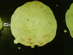 A tomato omelette (native name in Marathi = टॉमॅटो धिरडे) is a breakfast dish prepared mostly in Maharashtra, India. It is referred to as an omelette because of its visual appearance, but this is a misnomer, as it actually contains no egg product or by-product and is vegan . The main ingredient is chickpea flour or besan.[1] Sometimes, it is also made with dosa batter (rice flour and urad dal paste), with a small quantity of besan only to provide binding, in which case it is classified as Uttapam.