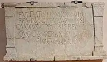 The surviving part of the inscription reads EST HOC MONIMENTVM MARCEI VERGILEI EVRYSACIS PISTORIS REDEMPTORIS APPARET, or in English, "This is the monument of Marcus Vergilius Eurysaces, baker, contractor, public servant."[1] While the final word in this quote, "Apparet", is often translated as public servant, the actual Latin word for a public servant is appāritor; the term can also apply to a gatekeeper, perhaps punning on the tomb's location. Appāret is a verb meaning "appears, makes apparent", this translation however does not seem to fit the rest of the inscription. The word Apparet is yet to be translated within the context of this quotation.