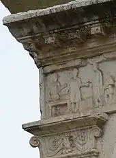 Three sides of the slightly trapezoidal structure remain largely intact. All have the same form, with a plain lower storey now mostly below ground level but exposed, consisting of pairs of engaged columns between flat vertical slabs, all crammed together with no space in between. The effect is far from the classical orders; at the corners the slabs turn to pilasters rising at the top level to unorthodox capitals combining scrolls at the sides with plant forms in the centre.[2] There are unusual circular openings in the topmost storey, now thought to represent kneading-basins or grain-measuring vessels. Below a cornice is the frieze, with continuous scenes in relief showing the operation of the bakery where Eurysaces made what was evidently a considerable fortune. Reconstructions imagine a gently rising roof above this, now lost.[3]