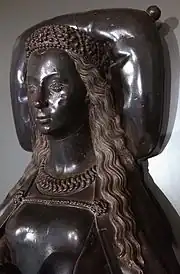 Isabella's effigy is in bronze and shows her head placed on a cushion and her hands joined in prayer. Her eyes are open and she has long wavy hair. She is wearing expensive jewelry and fashionable clothing including a diadem (a type of banded crown). Common to other tomb sculptures from the Burgundian court, the two small dogs at her feet represent her fidelity to her marriage.[2] Like the mourners, her face is not a faithful or "true" representation, but is instead idealised.[16]