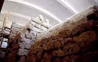 The interior of the structure is made up of two separate barrel-vaulted structures. The antechamber is unusually large: 6.5 m wide, 2.12 m long and 7.7 m high. This is because it is built to match the monumental scale of the facade.[1] The chamber seems to have been unpainted, but it was severely damaged in antiquity and has not been fully excavated.[2] The burial chamber is also barrel-vaulted, but is much smaller, measuring 4.8 m wide, 4.72 m long, and 5.26 m high.[1] The walls are covered in stucco. A white podium with a cornice runs around the base of the wall, supporting white stucco pilasters in low relief, which themselves support an architrave, topped by a cornice. The wall between the pilasters is painted red, and the faux architectural members are decorated with painted rosettes.[1] The design recalls wall painting in houses from the same period that have been excavated in Pella and Delos.[2] The grave goods included a wooden couch with ivory elements, most notably a small sculpture of a woman, which was found in the antechamber.[3]