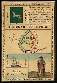 The governorate included eight uezds (okrugs since 1898): Biysk Uezd, Yenisei Uezd, Kainskiy Uezd, Krasnoyarsky Uezd, Kuznetskiy Uezd, Narymsky Uezd, Tomsky Uezd, and Turukhansky Uezd.[8][7]