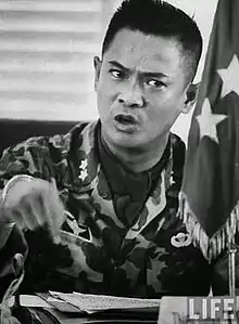 Đính once described himself as "fearless and arrogant" and Diệm's adopted son;[10] the president was a lifelong bachelor.[11] In August 1957, he was appointed commander of the 1st Division based in Huế, the old imperial capital and Cần's base. Đính served there for one year, until he became a one-star general and received a wider-reaching command in August 1958,[6][7] making him the youngest ever ARVN general.[12] Đính's favour among the Ngô family saw him appointed in 1958 to head the military wing of the Cần Lao, the secret organisation of Vietnamese Catholics loyal to the Ngô family that maintained the family's grip on power.[8][10]