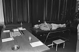 Miles won the British Championship just once, in 1982 when the event was held in Torquay. His prime time as a chess player was the mid-1980s. On 20 May 1984 in Roetgen (Germany), Miles set a European record in blind simultaneous chess with 22 games (+10−2=10);[5] this record was not broken until 2009. On the January 1984 Elo rating list, he ranked No. 18 in the world with a rating of 2599. One of his best results occurred at the Tilburg tournament in 1984, where, from a strong field, he emerged sole winner by a clear margin of one and one-half points. The following year, he tied for first at the same event with Robert Hübner and Viktor Korchnoi, playing several of his games while lying face down on a table, having injured his back.[6] The result was controversial, as many of Miles's opponents felt they were distracted by the unusual circumstances. A string of good performances culminated in a good showing on the January 1986 Elo rating list, where he climbed to a best-ever position of World No. 9 with a rating of 2610. During this period, there was considerable rivalry with John Nunn over who was the United Kingdom's best player, the two protagonists regularly leapfrogging each other in the world rankings. Nigel Short and Jon Speelman soon added to the competition, as the English national squad entered its strongest period.