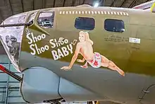 In 1981, Starcer recreated his nose art at Dover Air Force Base, Delaware,[4] for restored B-17G Shoo Shoo Baby, one of the few surviving combat veteran Flying Fortresses,[5] based on Alberto Vargas' "Hawaii" Esquire pin up art.[6] This B-17 flew 24 combat missions from England with the 91st BG, plus three aborts for mechanical problems, before being listed as missing in action on 29 May 1944. On its final mission, to the Focke Wulf aircraft component factory at Poznań, Poland, it crash-landed at Malmö Airport, Sweden, where it would see post-war service before becoming a museum piece.