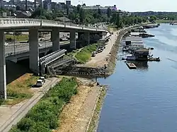 Due to the road, bridge and interchange construction, the section of the river was moved 20 m (66 ft) to the east. As this is the location where the stream of Kaljavi Potok flows into the Topčiderka, its mouth was also moved while the final 100 m (330 ft) of its flow were conducted underground, through the pipes. The new bridge is 19 m (62 ft) long and 26 m (85 ft) wide, with three lanes in each direction.[14] The works on the relocation of the river began on 1 March 2018,[15] and were finished by August 2019.[16] The bridge became operational on 22 March 2019.[17] Further widening of the boulevard along the river began in the late summer of 2019, and was set to finish in the spring of 2021, but the deadline was moved to September 2021, then to May 2022,[18] and to October 2022,[19] before the deadline was moved for the summer of 2024.[20]