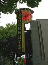 The name "Top Pot" came from a vintage neon sign that was above a boarded-up Chinese restaurant called "Topspot". The co-founders bought the sign and while transporting it, the "S" fell off. Co-owner Mark suggested that they replace it with a coffee pot.[9] Top Pot Doughnuts roast their own coffee at the 5th Ave location in Seattle