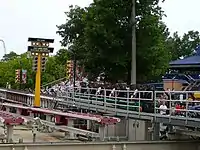 On August 15, 2021, in what was described as a "serious accident",[22] a guest waiting in line was struck in the head by a small metal piece that dislodged from a train as it was nearing the end of its run.[21] The guest was taken to a nearby hospital and was found to have suffered serious injuries.[21] The metal piece was later determined to be an L-shaped bracket called a flag plate, which signals the train's location to sensors positioned along the track.[49] Top Thrill Dragster was closed for the remainder of the season.[22]