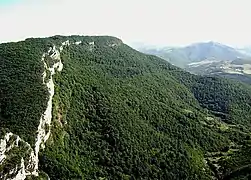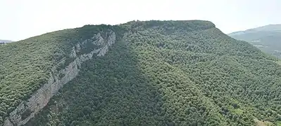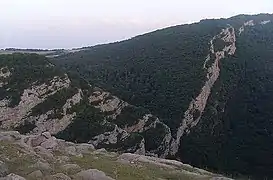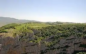 Topkhana is the name of a gently-sloping hillside opposite (and visible from) the town of Shusha, but separated from the town by deep gorge containing the Karkar (also known as the Dashalty) river. Its name derives from it being the location of cannons ("top" in Turkic languages) of Mohammad Khan Qajar during his siege of Shusha in 1795.[4] The forest was mentioned in Anar Rzayev's novel The Last Night of the Expiring Year first published in 1970.[5] Yevgeni Kotlyarov, USSR Master of Sports and specialist on athletic tourism, mentioned "forested slopes of the Topkhana plateau in Shusha" in his 1978 publication on mountain tourism in Karabakh.[6] In his book of critical reviews of Soviet literature, published in 1985, writer Elchin Afandiyev, who spent his younger years in Shusha, mentioned "staring into the dark blue depth of the mighty Topkhana forest" as a youth and "dreaming of having [his] first novel published".[7] In early November 1988, the site was described by Galina Starovoitova as home to "just one rather spindly tree and some scrubby bushes".[8]