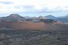 The archipelago of the Canary Islands is located in the North Atlantic Ocean, 1050 km southwest of the coast of Cadiz and 100 km west of the African coast. 460 km separate the western and eastern ends of the archipelago and 190 km separate the northern and southern limits of the archipelago. The Canary Islands are composed of seven main islands arranged from west to east and two islets, Alegranza and Graciosa.[2] It is of volcanic origin due to its formation by the accumulation of sediments from the eruptions, which in turn came from the Atlantic seafloor.[2] The terrain of the islands is mountainous, with an important presence of volcanoes and high coasts. The highest of them is the Teide (3718 m), located on the island of Tenerife, being also the highest of the Spanish territory and the third largest volcano in the world from its base.