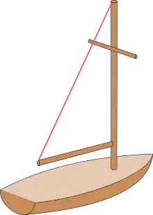 Part of the running rigging, topping lifts are primarily used to hold a boom up when the sail is lowered.[1] This line would run from near the free end of the boom(s) forward to the top of the mast. The line may be run over a block at the top of the mast and down to the deck to allow it to be adjusted. For small booms, the topping lift may be run from end of the boom to the backstay or next mast aft. When the sail is raised again, the topping lift is loosened or removed. On sailboats used for racing, boom lift function is frequently incorporated into the boom vang system, to reduce the number of lines aloft. Allowing the vang to take this function also simplifies operation of the boat.[2]