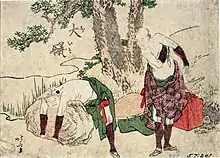 Traveler attempting to lift a Tora-ga-ishi by Hokusai