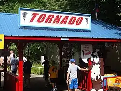 The Tornado made its debut on July 4, 1978, during Adventureland's third full season. It was designed by William Cobb, and built by the Frontier Construction Company.[1] The name Tornado has special significance for the park. Adventureland was to open for its debut season in July 1974. However, a real tornado hit the park before it could open, and caused it to be delayed until August of that year. When the ride debuted in 1978, park advertisements exclaimed "Another Tornado has hit Adventureland!"[2]