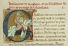 - ↑ The red text reads: Densavarics de maulleon, et en Gusellins faiditz, et en hugo de la bacalaria.