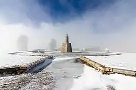 Torre is the culminating point of the Serra da Estrela range and as such tends to present the lowest temperatures and highest precipitation levels. The climate is defined as a transition between the typical Mediterranean climates seen south of the range and the not-so-typical oceanic climates found north of the range. Precipitation is very high, with around 2,400 mm (94 in), but when compared to lower valley regions of the range, rain is rather weak and continuous.[1] Snow can occur anywhere between October and May, mostly in February, but can be irregular.[2][3]