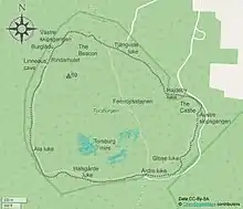 The fortification is approximately 1,300 m × 730 m–1,200 m (4,270 ft × 2,400 ft–3,940 ft) (E–W).[4] The enclosed area on Torsburgen is about twice the size of the land enclose by the Visby city wall.[1] The fort follows the natural edge of the plateau. The steep cliffs provide a natural protection for the hillfort in the west, north and east part of the plateau, with reinforcements and constructed walls in some places. In the northeast is a 40 m (130 ft) long wall made of large limestone blocks. The area is known as "The Castle" (Swedish: Slottet). In the southwest and south, the fort is protected by a 1.5 km (0.93 mi) long wall. The most western part of the wall is built of limestone slabs, while the southwest and south parts are made of limestone rubble and dirt.[4] The wall is 4–7 m (13–23 ft) high and up to 24 m (79 ft) wide.[2] On top of the wall was a palisade of logs.[1] The limestone used for building the wall was quarried on site at a small quarry in the north part of the plateau.[4] It has been estimated that the wall would take 3,000 men a year to build. Very little archaeological work has been done on Torsburgen, most of it is unexamined. Only four small metal objects have been retrieved during a minor excavation in connection to a restoration of the stone work at Ardre luke in 1983.[1][4][9]
