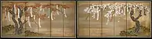25. Mitsuoki, Tosa (1649–1686). "Flowering Cherry and Autumn Maples with Poem Slips". Artic. Art Institute of Chicago.