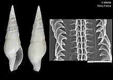 Shell and radula of Tosapusia turriformis (holotype at MNHN, Paris)