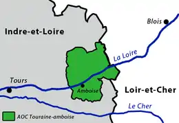 Touraine-Amboise is an Appellation d'Origine Contrôlée (AOC) for in the Loire Valley wine region in France. It is situated within the wider Touraine AOC wine appellation. It is produced by ten communes bordering both sides of the River Loire. To their west lies the town of Amboise with its famous royal château. Since its separation from the Touraine AOC in 1954, it has constituted an AOC in its own right. Annual production stands at 9,000 hectolitres of wine, spread between red, rosé, and still white wines. Effervescent wines are also produced within this AOC's boundaries, but they are not entitled to use the Touraine-Amboise appellation, belonging instead to the Touraine appellation.[1]