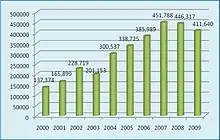A vivid example of the successful reform of the legal framework is the progressive increase of the number of visitors – the number reaching 450,000 in 2010 - tripling the 2000 estimate.[2] With one of the world's lowest population densities, the vastness of the Mongolian-Manchurian grassland, desert, as well as the numerous mountains, rivers and lakes offer plenty of adventure. Although backpacking is becoming more common, travel outside Ulanbataar is mostly arranged by tour operator companies.