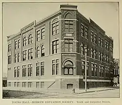 Touro Hall served as one of the centers of Jewish life in South Philadelphia's neighborhoods between 1890 and the 1940s. Many Jewish organizations held activities at Touro Hall including the Southern Branch of the Young Men's and Young Women's Hebrew Association, an employment agency, assistance for recent immigrants, and multiple charitable efforts.[6] It was used for Hebrew school, Sunday School, and English night school, trade schools for tin-smithing, carpentry, iron work, dress-making and millinery, garment cutting, upholstering, cigar-making, typewriting, stenography, and drawing, for lectures and entertainment, a University Extension, and a free synagogue.[1]
