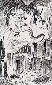 She created a set of illustrations for the 1962 Swedish edition of J. R. R. Tolkien's 1937 children's book The Hobbit.[26] The scholar of literature Björn Sundmark states that Jansson's work helped to define how Tolkien's Middle-earth fantasy could be depicted visually.[24] The edition with her illustrations was not reprinted for many years,[lower-alpha 3] even though reviewers and "Tolkienists" liked Jansson's "expressive"[25] images. Sundmark suggests that the reason was that in the 1960s, a new, more realistic style became the norm for fantasy art.[25]