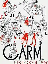 In the 1930s Jansson made several trips to other European countries. She drew from these for her short stories and articles, which she also illustrated, and which were also published in magazines, periodicals and daily papers. During this period, Jansson also designed many book covers, adverts and postcards. Following her mother's example, she drew illustrations for Garm, a Finnish-Swedish political and satirical magazine.[2]
