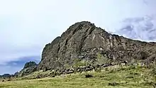 Tower Rock is a shonkinite intrusion.[15] As the surrounding rock weathered, the harder shonkinite remained behind.[16] The rock is roughly oblong, occupying about 87.2 acres (0.353 km2). The landform is 424-foot (129 m) high, and consists of clear outcrops at the north and south ends connected by a broken saddle ridge. The southern outcrop is 161 feet (49 m) higher than the northern outcrop. At its highest point, Tower Rock is 3,976 feet (1,212 m) above sea level.[15]