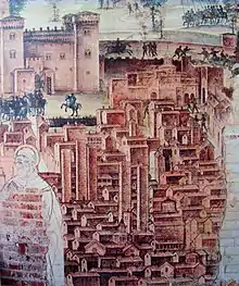 Characteristic of the historic center of Pavia is the presence of medieval noble towers that survive in its urban fabric, despite having once been more numerous, as evidenced by the sixteenth-century representation of the city frescoed in the church of San Teodoro. They were mostly built between the 11th and 13th centuries when the Ghibelline city was at the height of its Romanesque flowering.[1]