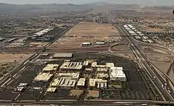 Town Square occupies approximately 100 acres (40 ha),[3] and is located one mile south of the Las Vegas Strip. Centra Properties initially bought 57 acres from The Howard Hughes Corporation, with plans to build an industrial park. This project was scrapped when Centra partnered with Turnberry Associates to buy an adjacent 27 acres. The purchase was finalized in January 2004, and included the Vacation Village hotel-casino, which closed in 2002. Vacation Village occupied what is now the southeast corner of Town Square. Additional acreage was also acquired from Clark County.[4][5][6] The property's location was considered desirable; its proximity to the Strip would make it an ideal tourist spot, and the site is also adjacent to Interstate 15 and the Las Vegas Beltway, providing easy access for local residents.[7]