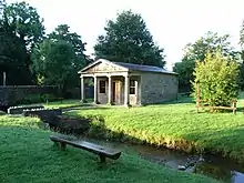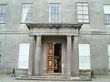 The house is 27 metres (89 feet) square, built in local stone with simple neoclassical lines, broken only by a Doric portico. The interior is dominated by a spiral staircase in a domed rotunda. The building replaced a previous house which once stood some 100 metres (330 feet) to the north of the present building