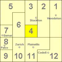 Rooks County was established with four townships: Bow Creek, Lowell, Paradise and Stockton. That number increased to seven by 1878[2] and twenty three in 1925. The twenty three townships were in place until 1971 when the number was reduced to the current twelve townships.[3]