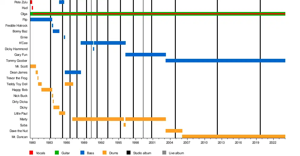 As of 2007, the band has had fourteen different drummers and twelve different bassists. Olga is the only remaining original member of the band. After Olga, drummer Martin Yule had the longest tenure in the band (1987–2000). Yule currently owns a shop in Sunderland called "Hotrats." Former drummer Dave "the Nut" Nuttall owns Jalapeño Drums, a custom drum company based in Lancaster, Lancashire. The current lead singer/guitarist with The Stranglers, Baz Warne, also had a stint with the band. Olga has played bass on tours with the US punk band The Dickies, and also with The Adicts. Gary Dunn, former bassist of The Toy Dolls (1997–1999), teaches music at Harton Academy, and former drummer, Trevor "The Frog" Brewis, teaches music at Middlesbrough College, though Olga moved away from the northeast of England a number of years ago, and now lives in London.