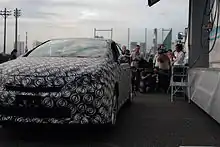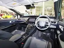 The Mirai is based on the Toyota FCV-R (Fuel Cell Vehicle) concept car, which was unveiled at the 2011 Tokyo Motor Show[17][18] and the Toyota FCV (Fuel Cell Vehicle) concept car, which was unveiled at the 2013 Tokyo Motor Show.[19] The unveiled FCV concept was a bright blue sedan shaped like a drop of water "to emphasize that water is the only substance that hydrogen-powered cars emit from their tailpipes." The FCV has a large grille and other openings to allow cooling air and oxygen intake for use by the fuel cell. According to Toyota, the FCV concept is close in appearance to the expected production version of the car.[20] The FCV size is similar to the Camry.[21] The FCV range is expected to be approximately 700 km (430 mi) under Japan's JC08 test cycle.[22]