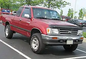 Rumored for many years before, the 1993 Toyota T100 boasted a full-size (8 ft) pickup bed but retained the engine and suspension setup of its smaller and older sibling, the compact Toyota Truck. Although the T100 was a bit larger than the competitive mid-size Dodge Dakota, it was still markedly smaller than full-size American pickup trucks of the time. This meant that the T100 occupied its own niche in the truck market.[1] Before introducing the T100, the company reflected on its history of commercial truck manufacture and products they offered in the past. Past products started with the Toyota G1, the Toyota FA, the Toyota BX, the Toyota Stout, the Toyota ToyoAce, and the Toyota Dyna, and its market successes with their Hino Division. Though economical, reliable, and practical, the T100 was slow to be accepted by traditional buyers of full-size competitors, while it was larger than both the Toyota Truck followed by the Toyota Tacoma compact trucks. Wary of the market pushback of competing directly with the Big Three, Toyota chose this somewhat smaller size (and limited lineup) so as not to risk blowback and import quotas.[2] The T100 was designed and engineered for the North American market and was not sold in Japan.