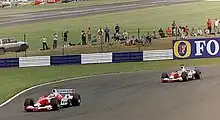 Olivier Panis leads teammate Cristiano da Matta during the British Grand Prix, where the Toyota cars briefly held a 1-2 lead