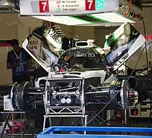 For the 2017 FIA World Endurance Championship, the TS050 underwent a substantial redesign, with majority of the previous year's bodywork being heavily modified or removed, with the monocoque being the sole piece of bodywork which was carried over. At the front of the car, the nose was raised slightly, while an undercut was made into the sidepod of the car. Internally, the car also underwent changes, with the coolers being relocated and the rear suspension layout being slightly modified.[8] Due to new regulations in the championship aimed at reducing the speeds of the cars, the front splitter was raised by 15 mm, while the rear diffuser was narrowed. Other regulations implemented as a form of cost control meant that only two aerodynamic configurations were introduced, down from the previous year's three.