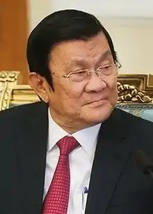 Trương Tấn Sang (born 21 January 1949) is a Vietnamese politician, who served as the seventh President of Vietnam from 2011 to 2016. He was one of Vietnam's top leaders, alongside prime minister Nguyễn Tấn Dũng and Party general secretary Nguyễn Phú Trọng.[1] In July 2011, Trương Tấn Sang was elected state president of the Socialist Republic of Vietnam by the National Assembly of Vietnam and nominated by his predecessor Nguyễn Minh Triết who retired from office.