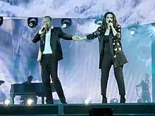 During the live show Amiche per l'Abruzzo, created by Pausini herself in support of the populations affected by the 2009 L'Aquila earthquake, Pausini performed "Tra te e il mare" as a duet with Italian singer Elisa.[10] In 2014, during his concert at the San Siro stadium in Milan, Antonacci sang "Tra te e il mare" with Eros Ramazzotti and Laura Pausini.[11] The live recording was featured on the album Palco Antonacci.[12]