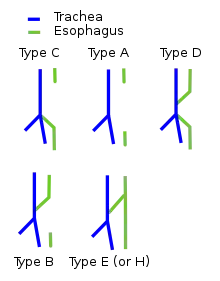 | Type E (or H-Type) | - | A variant of type D: if the two segments of esophagus communicate, this is sometimes termed an H-type fistula due to its resemblance to the letter H. TEF without EA. | No | Yes |
